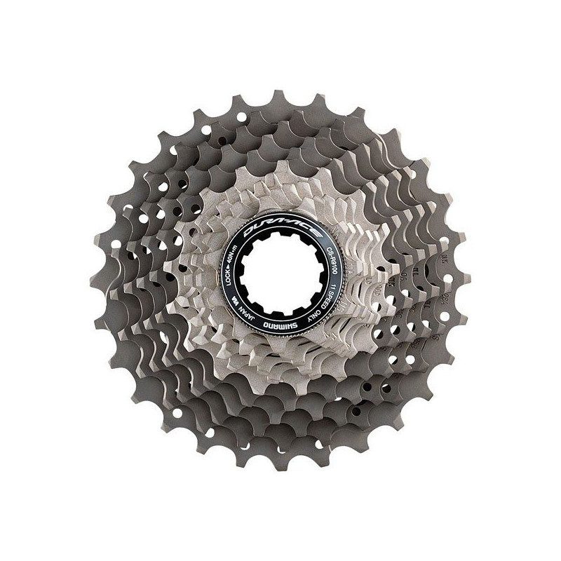L'avis Velosetvtt.com : Légèreté, fiabilité et un large choix d'étagements caractérise cette nouvelle cassette Shimano Dura Ace . La nouvelle cassette Shimano Dura Ace ICSR9100 a été conçue pour atteindre les plus hauts sommets grâce à sa version 11-30 . Pour limiter au maximum le poids, elles sont dotées de 5 pignons en titane . La qualité de fabrication assure un passage de vitesses fluide et silencieux, sans craquement . Cette cassette Dura Ace 9100 est entièrement compatible avec les autres transmissions 11 vitesses Shimano . Idem pour les transmissions Sram à condition d'être utilisée avec une chaine Shimano . Se monte également en cyclo-cross sur des transmissions doubles ou mono-plateau . - 11 vitesses - 5 pignons en titane - Existe en 11-25, 12-25, 11-28, 12-28 et 11-30 étagements disponibles : 11-25 : 11.12.13.14.15.16.17.19.21.23.25 : 175 grammes12-25 : 12.13.14.15.16.17.18.19.21.23.25 : 189 grammes11-28 : 11.12.13.14.15.17.19.21.23.25.28 : 193 grammes 12-28 : 12.13.14.15.16.17.19.21.23.25.28 : 205 grammes 11-30 : 11.12.13.14.15.17.19.21.24.27.30 : 211 grammes Cassette vendue avec écrou de serrage !