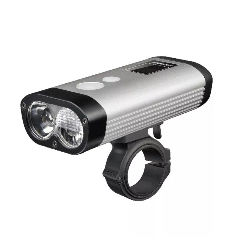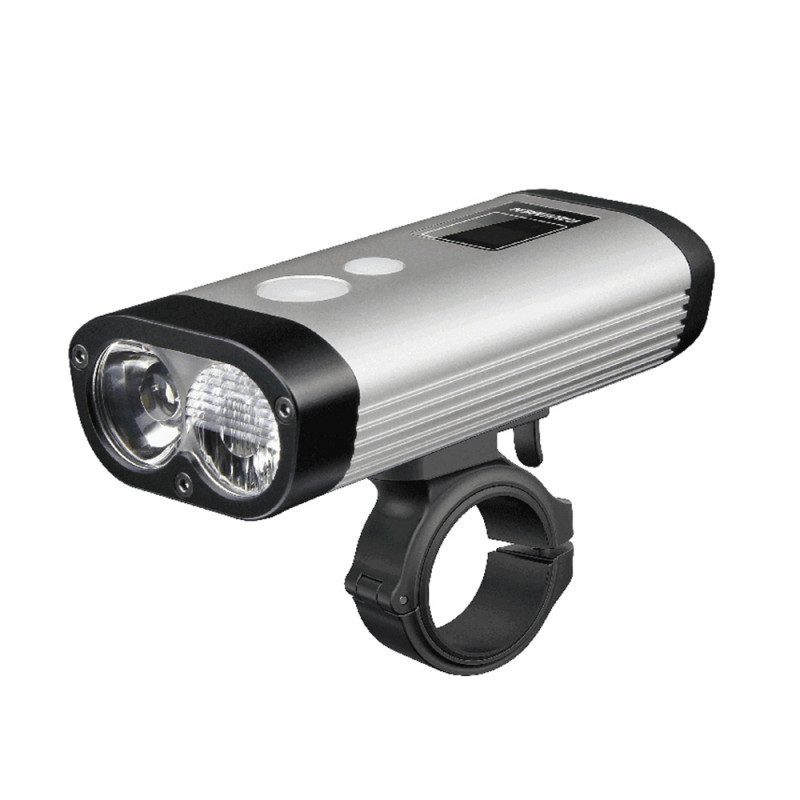 Caractéristiques techniques - éclairage avant avec fixation rigide - Puissance maximale de 900 lumens - 4 modes vélo route : 50lms(20hrs)-100lms(13.5hrs)-200lms(7.5hrs)-400lms(4.5hrs)-clignotant (100lms) - 3 modes VTT : 300lms(7hrs)-500lms(3.5hrs)-800lms(2.5hrs) - Batterie 5200mAh - écran digital pour l'état de la batterie - Livré avec bouton filaire, câble Micro USB et support de fixation cintre - étanche IPX8 et résistant è la pluie - Marque Ravemen