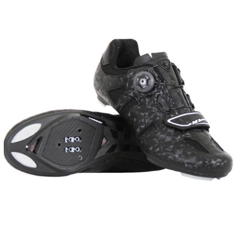 Caractéristiques : - Serrages rotatif et Velcro pour un ajustement uniforme et un réglage millimétrique - Pointe et talon renforcés - Semelle en fibre de nylon : Nylon Force II Race - Crampons injectés en Nylon et résistants è l'usure - Semelle intérieure en mesh respirant et antidérapant - Compatible avec les cales 3 vis (Look, Time, SPD Road) et cales 2 vis (SPD MTB et cyclo, Look MTB) - Poids : 275 grammes - Couleur : Noir - Tailles : 37 è 47