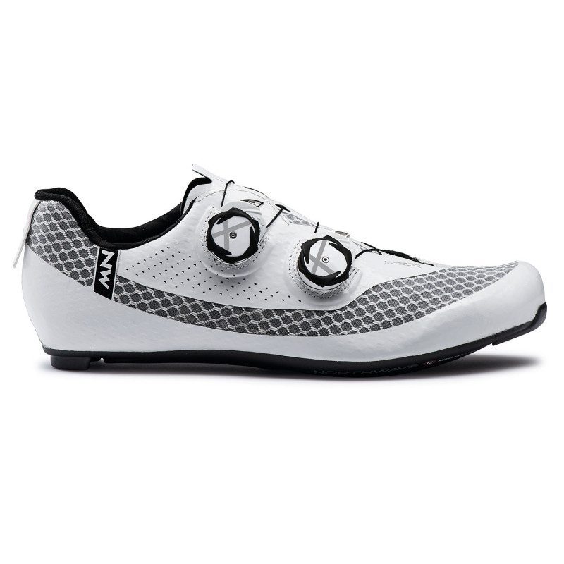 Caractéristiques techniques : - Semelle en carbone avec indice de rigidité de 12 - Insert en carbone au niveau des orteils - Deux fermetures micrométriques SLW3 Rotor - Inserts en mesh 3D avec cellules hexagonales - Heel System pour le maintien du talon - Câbles de serrage en Dyneema - Micro-perforations latérales - Très haute ventilation et confort - Poids de la paire : 265g - Marque NorthwaveGuide des tailles Northwave