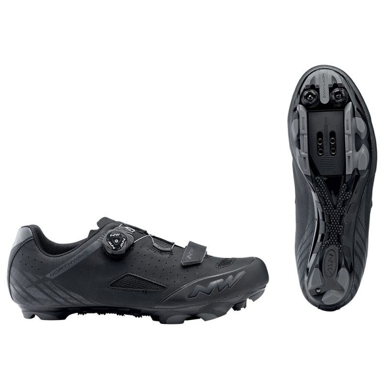 Caractéristiques techniques : - Construction monocoque - Coutures limitées - Nombreuses perforations sur l'empeigne - 4 inserts en mesh - Serrage par molette SLW2 et bande velcro - Semelle externe Speedlight en fibre de verre avec protection en TPU - Indice de rigidité : 10/14 - Coloris : noirGuide des tailles Northwave