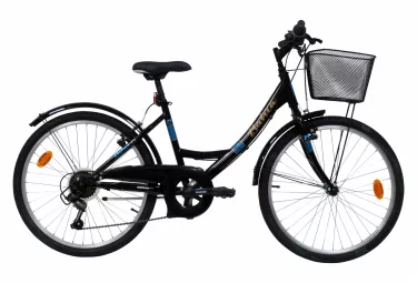vtc 24 bahia fille cadre acier avec enjambement bas fourche rigide 6 vitesses indexees par poignee tournante roue libre 6 vitesses derailleur arriere shimano ty35 potence plongeur freins avant et arriere v brake avec etriers acier et leviers aluminium jantes aluminium et pneus noirs panier avant gardes boue protege derailleur bequille selle avec attache rapide sonnette eclairage a piles fournies