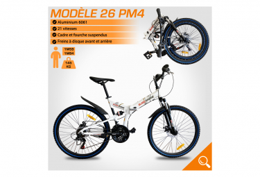 dernier modele en date ce modele constitue une veritable evolution dans la gamme blanc marine nous avons fait le choix d equiper notre modele d un cadre suspendu combinant a la fois fourche suspendue a l avant et amortisseur a l arriere depuis 1999 nous avons toujours donne la priorite au confort car si vous vous sentez bien sur votre velo pliant blanc vous l utiliserez bien plus que vous ne le pense les nouvelles suspensions sur le cadre et la fourche reglables en composite permette un confort incomparable la tige de selle a ete reculee derriere l axe du pedalier ameliorant encore les sensations et la position ergonomique du cycliste l aluminium 6061 a ete utilise pour ameliorer encore la rigidite et le confort avec egalement un gain de poids les deux freins a disque vous permettent de rouler en toutes securite 2 nouveaux systemes encore plus rapides de verrouillage et de deverrouillage du cadre avec toujours un double systeme de securite empechant l ouverture sont utilises sportif ou cycliste occasionnel avancez a votre rythme avec les 7 vitesses qu offrent le triple plateaux et la cassette 7 vitesses de la roue arriere caracteristiques cycle du 26pm4 marque blanc marine cadre suspendu aluminium 6061 soudures tig suspensions dual confort durete reglagle en fonction du poids fourche suspendue shock block suntour crv 8 nombre total de vitesses 7 vitesses pedalier simple plateau prowheel 42 pedalier specifications prowheel mc ac26 152mm protection pedalier oui derailleur arriere shimano tz50 roue libre pignon shimano mf tz21 arceau de protection du derailleur oui nombre de dents roue libre 14 16 18 20 22 24 28 dents poignet changement vitesse derailleur shimano tournante 7 vitesses shimano 7 vitesses sl tx30 7r freins avant a disque a triage laterale tektro freins arrieres a disque a triage laterale tektro pedales resine pliante droite gauche potence aluminium a plongueur fixe systeme de deverouillage de la potence oui guidon aluminium poignees caoutchouc confort selle royal confort bicolore tube de selle aluminium anodise noir 330mm x 27 2mm jantes aluminium double parois nombre de rayon 36 taille des roues 26 pouces pneu emotion freeride 26 x 1 75 moyeu aluminium bequille oui garde boue oui norme velo en14764 dimensions garanties et options dimensions depliees 186 x 69 x 113 cm hauteur selle mini maxi empattement 108 cm dimensions pliees 94 x 82 x 36 cm poids du velos pliant 26 pm4 13 8 kg icone poids charge maximale 160 kg icone poids garantie cadre fourche velo pliant 5 ans garantie moteur 1 an garantie batterie 1 an garantie boitier electronique 1 an sac de transport non antivol non sacoche avant non anticrevaison non porte bagage en option