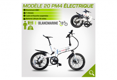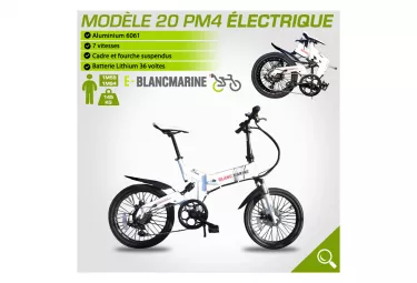 le nouveau modele 20pm4 constitue une veritable evolution dans la gamme des velos pliants blanc marine en effet nombreux sont nos clients qui privilegie le confort surtout en milieu urbain depuis 1999 nous avons toujours donne la priorite au confort car si vous vous sentez bien sur votre velo pliant blanc vous serez surpris par les distances que que vous allez parcourir le modele 20pm4 va encore plus dans cette logique avec un nouveau cadre en y suspendu avec un nouvelle suspension reglable en composite le bras oscillant arriere comme sur une moto a egalement ete modifie afin d avoir une position encore plus haute avec un dos bien droit lorsque vous pedalez la tige de selle a ete recule derriere l axe du pedalier ameliorant encore les sensations et la position ergonomique du cycliste une fourche telescopique ultra legere a ete monte suite a la demande de beaucoup de nos clients l aluminium 6061 a ete utilise pour ameliorer encore la rigidite et le confort avec egalement un gain de poids 2 nouveaux systemes encore plus rapides de verrouillage et de deverrouillage du cadre avec toujours un double systeme de securite empechant l ouverture sont utilises caracteristiques cycle marque blancmarine modele 20 pm4 electrique cadre suspendu aluminium 6061 soudures tig suspension dual confort plus fourche suspendue shock block suntour crv 8 pedalier prowheel mc ac26 152mm nombre dents pedaliers oui protection pedalier oui derailleur avant triple plateaux prowheel 42 32 22 dents derailleur arriere shimano tz50 roue libre pignon shimano mf tz21 nombre dents roue libre 14 16 18 20 22 24 28 dents poignee changement vitesses plateaux shimano tournante 3 vitesses shimano 3 vitesses sl tx30 ln poignee changement vitesses derailleur shimano tournante 7 vitesses shimano 7 vitesses sl tx30 7r freins avant a disque a tirage laterale tektro freins arriere a disque a tirage laterale tektro pedales resine pliantes droite gauche nombre de vitesses 7 vitesses arceau de protection du derailleur oui potence aluminium a plongeur fixe systeme de deverouillage de la potence oui guidon aluminium poignees caoutchouc confort plus selle royal confort plus bicolore tube de selle aluminium anodise noir 300mm x 27 2 mm jantes aluminium double parois nombre rayons 36 taille des roues 20 pouces pneus emotion freeride 20 x 1 75 moyeu aluminium bequille oui garde boue oui norme velo en14764 caracteristiques electrique type batterie lithium ion puissance batterie 36 volts 09 amperes autonomie 55 a 70 km nombre de cycles 800 a 900 cycles type d assistance on off nombre de niveau d assistance variable moteur electrique puissance marque 250 watts brusless 8fun positionnement moteur roue arriere batterie amovible oui positionnement de la batterie interieur cadre blocage avec clef temps de charge 2h 2h30 vitesse maximale avec moteur 25 km h systeme pedelec oui norme batteries en55022 en61000 3 2 en61000 3 3 en55024 norme moteur electrique en 15194 chargeur de batterie inclus dimensions garanties options dimensions depliees 148 x 124 cm empattement 103 cm dimensions pliees 74 x 68 x 34 cm poids du velo pliant 26pm4 18 2kg charge maximale 160 kg garantie cadre fourche velo pliable 5 ans garantie moteur 2 ans garantie batterie 2 ans garantie boitier electronique 2ans sac de transport non antivol non sacoche avant non anticrevaison non pompe a main non porte bagage en option