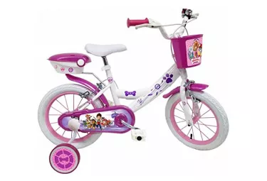 velo 14 pat patrouille a l effigie de stella skye pour enfant de 4 a 6 ans cadre surbaisse acier pour enjambement aise direction et pedalier en nylon roue libre monovitesse freins avant et arriere calliper selle reglable carter de chaine integral gardes boue et poignees specifiques pour augmenter la protection de l enfant jantes a rayons pneus gonflables noirs stabilisateurs montage sans outil panier avant coffre arriere avertisseur sonore eclairage a piles fournies