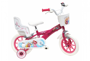 velo 12 princesse pour enfant de 3 a 5 ans cadre acier direction et pedalier en nylon pignon fixe frein avant et arriere calliper carter de chaine integral gardes boue et poignees specifiques pour augmenter la protection de l enfant roues batons pneus eva increvables stabilisateurs montage sans outil panier avant et porte poupee arriere avertisseur sonore