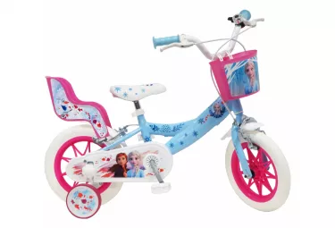 velo 12 reine des neiges pour enfant de 3 a 5 ans cadre acier kappa direction et pedalier en nylon pignon fixe frein avant et arriere calliper carter de chaine integral gardes boue et poignees specifiques pour augmenter la protection de l enfant roues batons pneus eva increvables stabilisateurs montage sans outil panier avant et porte poupee arriere avertisseur sonore