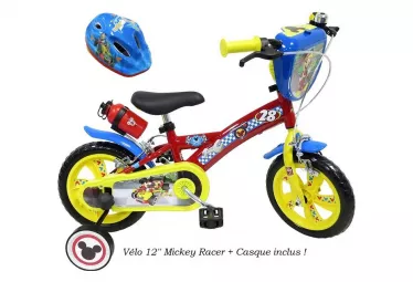 velo 12 mickey casque pour enfant de 3 a 5 ans cadre acier direction et pedalier en nylon pignon fixe freins avant et arriere calliper carter de chaine integral gardes boue et poignees specifiques pour augmenter la protection de l enfant roues batons stickees pneus eva increvables stabilisateurs montage sans outil plaque decorative avant gourde avertisseur sonore