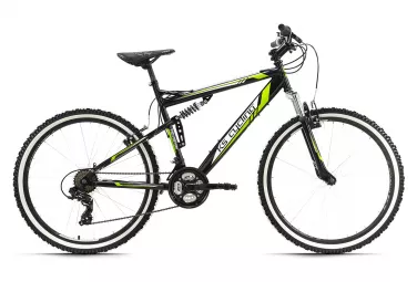 bien pense de la selle aux pneus ce vtt et ses roues de 26 enthousiasme par son cadre noir et ses stickers verts tres elegants le vtt tout suspendu est equipe d un derailleur shimano 21 vitesses un frein v brake assure le freinage a l arriere le cadre tout suspendu vous permet de garder le controle sur tout type de terrain caracteristiques techniques caracteristiques techniques cadre acier hi ten suspendu taille de cadre 51 cm couleur noir fourche suspendue avec tige filetee 1 1 8 jeu de direction ahead potence ahead en acier guidon acier moyeux axe plein jantes double paroi aluminium avec indicateur d usure pneus kenda a crampons 26 x 2 10 50 559 vitesses derailleur 21 vitesses derailleur ar shimano tourney derailleur av 3 plateaux leviers de vitesses sram mrx pignon filete 7 vitesses 28 12 dents pedalier acier 3 plateaux 42 34 24 dents et anneau de protection roulement de pedalier bsa 68 a cartouche pedales resine 9 16 selle vader tige de selle acier droite o 25 4 mm fixation de selle anneau de serrage a vis freins v brake en aluminium leviers de freins aluminium composite poids environ 17 kg