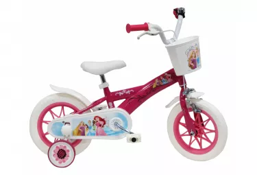 velo 12 princesse pour enfant de 3 a 5 ans cadre acier surbaisse pour enjambement aise direction et pedalier en nylon pignon fixe frein avant calliper carter de chaine integral gardes boue et poignees specifiques pour augmenter la protection de l enfant roues batons pneus eva increvables stabilisateurs montage sans outil panier avertisseur sonore