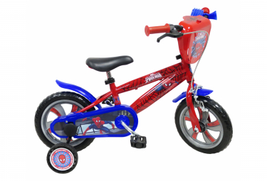 velo 12 spiderman pour enfant de 3 a 5 ans cadre acier direction et pedalier en nylon transmission monovitesse pignon fixe freins avant calliper carter de chaine integral gardes boue et poignees specifiques pour augmenter la protection de l enfant roues batons stickees pneus eva increvables stabilisateurs montage sans outil plaque decorative avant avertisseur sonore