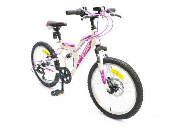 vtt 20 star tout suspendu fille cadre acier avec suspension centrale fourche telescopique 6 vitesses indexees par poignees tournantes roue libre 6 vitesses derailleur arriere indexe potence plongeur freins avant a disque et arriere v brake avec etriers acier et leviers en resine noire jantes aluminium et pneus noirs blocage rapide tige de selle protege derailleur sonnette eclairage a piles fournies