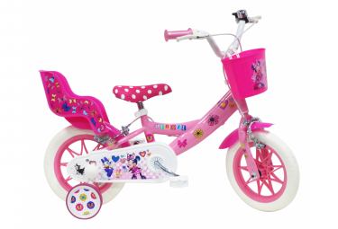 velo 12 minnie pour enfant de 3 a 5 ans cadre acier direction et pedalier en nylon pignon fixe frein avant et arriere calliper carter de chaine integral gardes boue et poignees specifiques pour augmenter la protection de l enfant roues batons pneus eva increvables stabilisateurs montage sans outil panier avant et porte poupee arriere avertisseur sonore