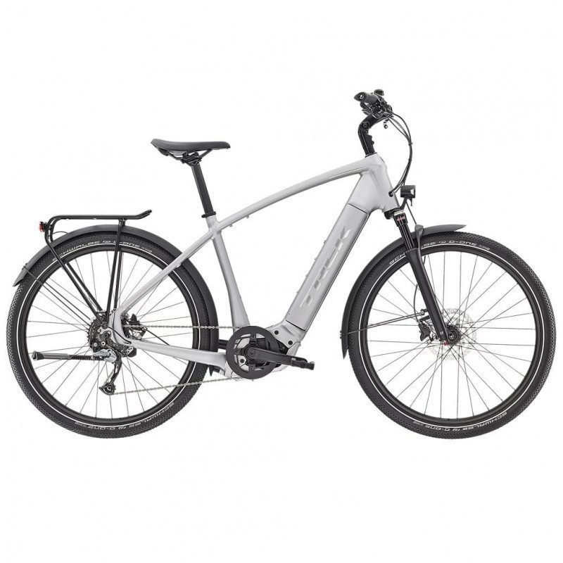 Caractéristiques techniques : - Batterie : Bosch PowerTube, verticale, 500 wh - Controleur : Bosch Purion - Moteur : Bosch Performance Line CX, 75 Nm, 25 km/h - Cadre : Cadre de vélo à assistance électrique hydroformé ultra-performant avec batterie intégrée (compatible Range Boost) et protection Motor Armor, acheminement interne des câbles, freins à disque à fixation Post-Mount, pattes QR 5 mm - Fourche : SR Suntour Mobie25, débattement de 45 mm, précontrainte, rebond et blocage, pivot en alliage conique, axe traversant 100x15 mm, frein à disque à fixation Post-Mount - Roues : Alex MD35, Tubeless Ready, 32 trous, largeur 35 mm, valve presta - Pneus : Schwalbe G-One, 650Bx57C - Leviers : Shimano Acera 9 vitesses - Dérailleur arrière : Shimano Acera M3000, design Shadow, longue chape - Pédalier : ProWheel alliage - Cassette : Shimano HG200, 11-36, 9 vitesses - Chaîne : Shimano HG53, 9 vitesses - Pédales : VP noir avec catadioptres - Selle : Alliage Bontrager, 31,6 mm, déport de 12 mm - Tige de selle suspendue : Alliage Bontrager, 31,6 mm, déport de 12 mm - Grips : Bontrager Satellite Plus, ergonomique - Potence : Bontrager réglable, compatible avec Blendr - Cintre : Confort aluminium - Jeu de Direction : Roulement à cartouche étanche intégré FSA, 1,125 pouce sur le haut, 1,5 pouce sur le bas - Freins à disque : Shimano MT200 disque, hydrauliques, fixation Post-Mount, disque de 180 mm - Couleur : Matte Quicksilver - Tailles : M, L, XL - Poids : 21.5kg en taille M