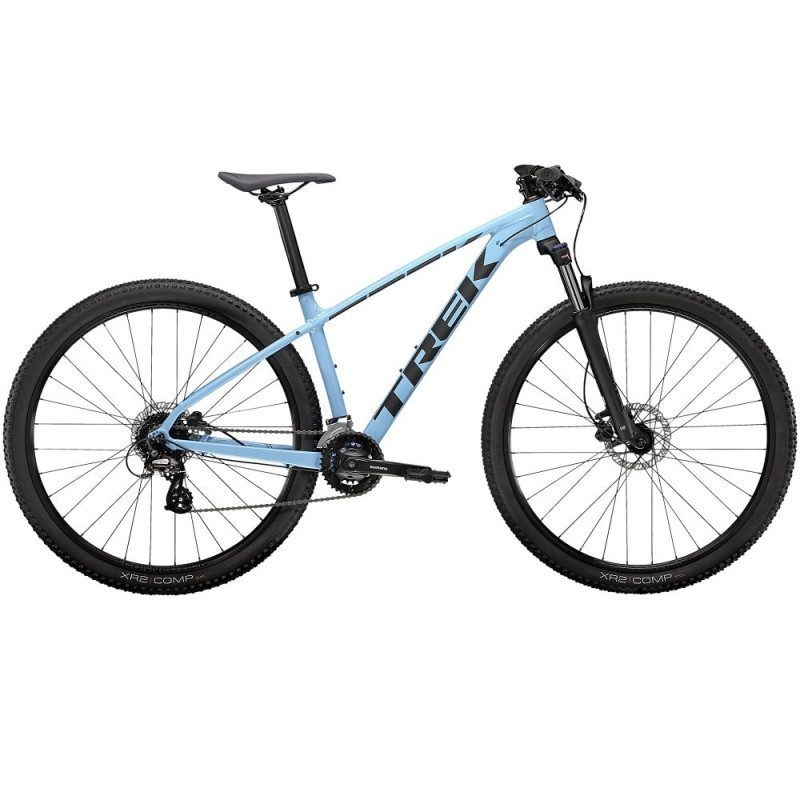 CARACTéRISTIQUES : - Cadre : Alpha Silver aluminium, acheminement interne, fixation du frein à disque sur la base arrière, fixations pour porte-bagages et béquille, QR 135x5 mm - Fourche : SR Suntour XCT 30, ressort hélicoïdal, précontrainte, blocage hydraulique, déport de 46 mm pour roue de 29 pouces, QR 100 mm, débattement de 100 mm - Roues : Bontrager Connection, alliage, double paroi, 32 trous, largeur de 20 mm, valve schrader - Pneus : Bontrager XR2 Comp, tringle rigide, 30 tpi, 27,5x2,2 pouces - Manettes de vitesses : Shimano Altus M315, 8 vitesses - Dérailleur arrière : Shimano Altus M310 - Pédalier : Shimano M315, 36/22, longueur de 175 mm - Cassette : Shimano 8 vitesses 12-32 dts - Chaîne : KMC Z8.3, 8 speed - Pédales : VP-536, plateforme, nylon - Selle : Bontrager Arvada, rails en acier, largeur de 138 mm - Tige de selle : Alliage Bontrager, 31,6 mm, déport de 12 mm - Cintre : Alliage Bontrager, 31,8 mm, élévation 5 mm - Poignées : Bontrager XR Endurance Comp - Potence : Alliage Bontrager, 31,8 mm, compatible Blendr, 7 degrés - Jeu de direction : Semi-intégré, 1,125 pouce - Kit de Freinage : Freins à disque hydrauliques Tektro HD-M275 - Poids : 13,975 kg (M) - Tailles : XXS à XXL (XXS : roues de 26 ; XS et S : roues de 27,5 ; M et plus : roues de 29) - Couleur : Azure Poids maximum : Ce vélo affiche une limite de poids total maximale de 136 kg (comprenant le poids du vélo, du cycliste et des bagages).