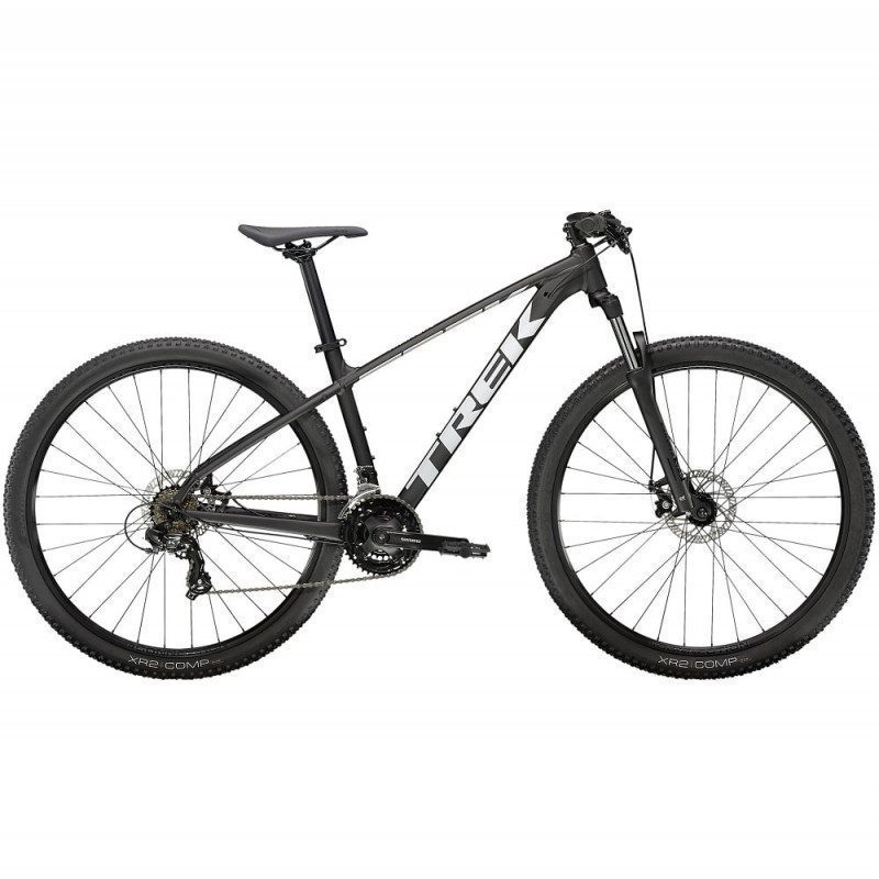 Caractéristiques techniques : - Cadre : Alpha Silver aluminium, acheminement interne, fixation du frein à disque sur la base arrière, fixations pour porte-bagages et béquille, QR 135x5 mm - Fourche : SR Suntour XCE 28, ressort hélicoïdal, précontrainte, débattement de 100 mm (80mm en XS) - Roues : Bontrager Connection, double paroi, 32 trous, largeur de 20 mm, valve schrader - Pneus : Bontrager XR2 Comp, tringle rigide, 30 tpi, 27,5x2,2 pouces (XS, S) ou 29x2,2 pouces (M, ML, L, XL, XXL) - Manettes de vitesses : Shimano Altus EF500, 7 vitesses - Dérailleur avant : Shimano Tourney TY300, collier 34,9 mm, down swing, down pull - Dérailleur arrière : Shimano Tourney TY300, longue chape, pignon 34 dts max - Pédalier : Shimano Tourney TY301, 42/34/24, longueur de 170 mm (XS, S, M) ou longueur de 175 mm (L, XL, XXL) - Boîtier de pédalier : VP BC73, 73 mm, cartouche filetée - Cassette : Shimano TZ500, 14-28, 7 vitesses - Chaîne : KMC Z7, 7 vitesses - Pédales : VP-536, plateforme, nylon - Selle : Bontrager Arvada, rails en acier, largeur de 138 mm - Tige de selle : Alliage Bontrager, 31.6 mm, déport de 12 mm, longueur de 330 mm (XS, S), longueur de 360 mm (M) ou longueur de 400 mm (L, XL, XXL) - Cintre : Alliage Bontrager, 31.8 mm, élévation 5 mm, largeur de 690 mm (XS, S) ou largeur de 720 mm (M, ML, L, XL, XXL) - Grip : Bontrager XR Endurance Comp - Potence : Alliage Bontrager, 31,8 mm, compatible Blendr, 7 degrés, longueur de 50 mm (XS), 60 mm (S), 70mm (M), 80mm (L) ou 90mm (XL, XXL) - Jeu de direction : Semi-intégré, 1,125 pouce - Kit de Freinage : Freins à disque mécaniques Tektro MD-M281 ou MD-M280 mécaniques, disque de 160 mm - Poids : 13.98 en taille M - Couleur : Matte Trek Black - Tailles : du XS à XXL (tailles XS/13,5 et S/15,5 pouces : roues de 27,5)La limite de poids total de ce vélo (avec le vélo, le cycliste et les bagages) est de 136 kilos.