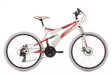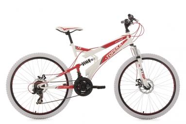 la star des velos tout terrain le vttetnbsp 26 tout suspendu topeka de ks cycling et son cadre blanc decore de details rouge petant les pneus blanc en font un veritable attrape regards ce vtt tout suspendu est equipe d un derailleur shimano 21 vitesses et de poignees tournantes des freins a disque mecaniques a l avant et a l arriere garantissent un freinage efficace le topeka et son cadre de petite taille conviendra aux hommes comme aux femmes c est parti pour le fun cadre acier hi ten tout suspendu fourche suspendue tige filetee 1 jeu de direction jeu de direction pour fourche filetee potence potence a plongeur guidon acier riserbar moyeux av acier ar roue libre acier pneus a crampons 26 x 1 95 54 559 jantes jantes en aluminium avec indicateur d usure changement de vitesses derailleur 21 vitesses derailleur ar shimano tourney derailleur av shimano fd tz30 leviers de vitesses poignees tournantes shimano micro shift pignon filete 7 vitesses 28 12 dents pedalier acier prowheel plateaux 42 34 24 dents roulement de pedalier roulement a cone pedales resine selle vtt ks xtr tige de selle acier droite o 25 4 mm fixation de selle boulon de serrage freins freins a disque mecaniques v luxe disque wave o 160 mm leviers de freins aluminium composite poids environ 17 5 kg