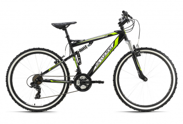 bien pense de la selle aux pneus ce vtt et ses roues de 26 enthousiasme par son cadre noir et ses stickers verts tres elegants le vtt tout suspendu est equipe d un derailleur shimano 21 vitesses un frein v brake assure le freinage a l arriere le cadre tou