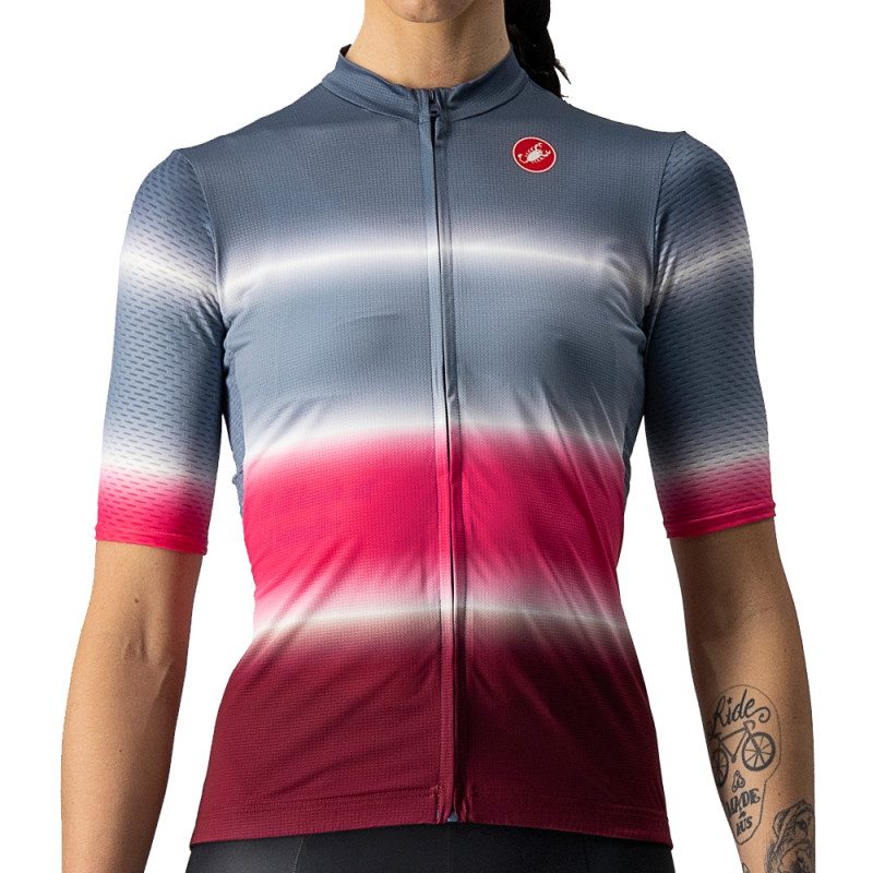 Caractéristiques techniques : - Coloris : Rose - Tailles : M, L - Plages de températures : 18-38 degrés - Poids : 106 grammes - Tissu extensible micromesh aéré Strada à l'avant et l'arrière - Tissu extensible alvéolé Tailwind sur les manches, les panneaux latéraux anatomiques et les poches - Fermeture à glissière YKK Vislon - élastique en silicone à la tailleGuide des tailles Castelli