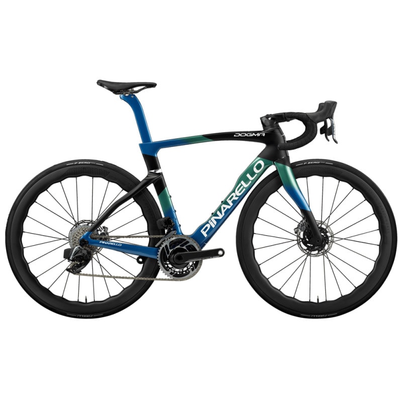Caractéristiques techniques : Cadre : - Cadre : TorayCa T1100 1K Dream Carbon with Nanoalloy technology, TiCR cable routing, Italian BB, UCI approved - Fourche : F Onda Fork with ForkFlap, 1.5' upper and lower steerer, Ultra Light Headset bearingsTransmission : - Pédalier : Sram Red ETAP AXS 12v - Cassette : Sram Red XG-1290 - Chaine : Sram Red 12v - Poignées : Sram Red 12v - Dérailleur avant : Sram Red ETAP AXS 12v - Dérailleur arrière : Sram Red ETAP AXS 12vFreinage : - Freins : Sram Red 2 pistons caliper - Disques : 160mm à l’avant et l’arrièreComposants : - Cintre : Most Talon Ultra Light - Potence : Most - Selle : Most Lynx Ultrafast Superflow L Carbon Large 145mm - Tige de selle : Pinarello Aero seatpost with 3D printed titanium top seatclamp and boltsRoues : - Roues : Princeton Peak 4550 - Pneus : Pirelli P Zero Race 26mm - Black, 127 tpi aramid breaker . Max tyre size 28mmInformations générales : - Coloris : E125 Nebula Green Blue - Tailles : 43, 46.5, 50, 51.5, 53, 54, 55, 56, 57.5, 59.5, 62 - Marque : Pinarello Géométrie : (mm) 43 46.5 50 51.5 53 54 55 56 57.5 59.5 62 A 502.4 517.6 525.4 532.3 542.6 551.2 561.6 570.2 584.8 613.3 651.7 B 351.4 364.8 372.1 378 383.3 385 388.8 390.7 396.7 393.3 410.1 C 97 104 109 114 123 131 142 149.5 163 199 239