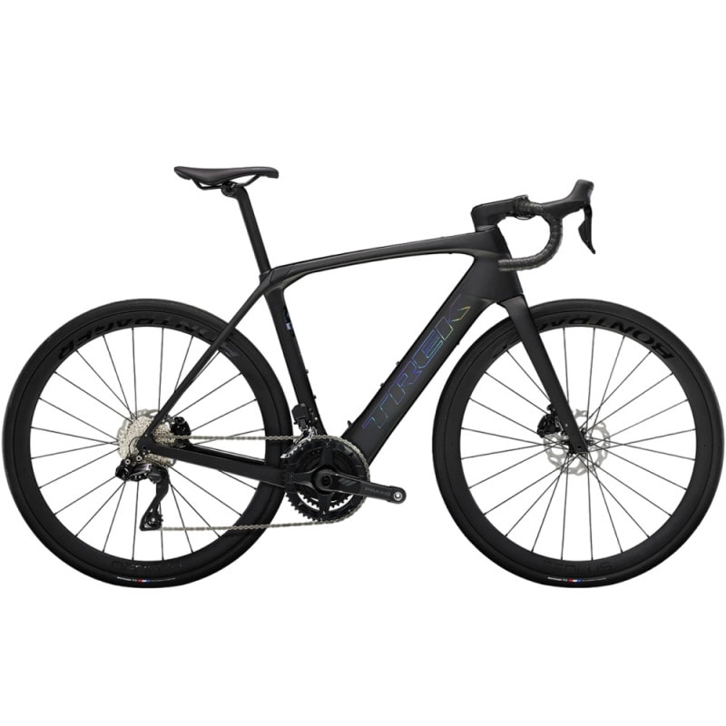 CARACTÉRISTIQUES TECHNIQUES : Cadre : - Cadre : OCLV Carbon Série 800, transmission TQ, tube de direction conique, IsoSpeed à l’arrière, acheminement interne des câbles, disque à fixation Flat-Mount, fixations de garde-boue - Fourche : Domane+ carbon, tapered carbon steerer, internal brake routing, fender mounts, flat mount disc - Axes : 12x142mm / 12x100mmTransmission : - Poignées : Shimano 105 Di2 12v - Pédalier : Praxis Carbon - Taille de pédalier : 170mm (50-52) / 172.5mm (54-56) / 175mm (58-60-62) - Dérailleur avant : Shimano 105 Di2 - Dérailleur arrière : Shimano 105 Di2 12v - Cassette : Shimano 105 12v 11-34 - Chaine : Shimano SLX M7100 12vFreinage : - Freins : Shimano 105 hydraulic disc - Disques : Shimano RT70, centerlock, 160 mmComposants : - Cintre : Bontrager Pro IsoZone VR-SF - Taille de cintre : 40mm (50-52) / 42mm (54-56) / 44mm (58-60-62) - Potence : Bontrager RCS Pro, -7 degré - Taille de potence : 80mm (50) / 90mm (52-54) / 100mm (56-58) / 110mm (60-62) - Selle : Bontrager Verse Short Elite, rails en acier inoxydable creux, 155mm (50-52) / 145mm (54 à 62) - Tige de selle : Domane carbone, forme KVF, déport de 20 mm - Ruban de cintre : Bontrager Supertack PerfRoues : - Roues : Bontrager Aeolus Pro 37, Carbone OCLV, Tubeless Ready, 37 mm - Pneus : Bontrager R3 Hard-Case Lite, Tubeless Ready, tringle en aramide, 120 tpi, 700x32CMotorisation : - Moteur : TQ-HPR50, 50 Nm - Batterie : TQ 360 Wh - Chargeur : Chargeur TQ 4A - Assistance maximale : 250 W et 300 W de puissance de pointe - Compteur : Écran LED de TQ avec Bluetooth et connectivité ANT+Informations générales : - Coloris : Noir Mate - Tailles : 50/52/54/56/58/60/62 - Géométries des tailles en galerie photos - Poids : 12,4kg (56) - Poids maximum : 125kg - Marque : Trek Géométrie :  (mm) 50 52 54 56 58 60 62 A 546 561 575 591 611 632 656 B 368 371 374 377 380 383 386 C 130 145 160 175 195 220 245 D 450 475 500 525 548 567 586 E 519 530 542 554 567 579 593