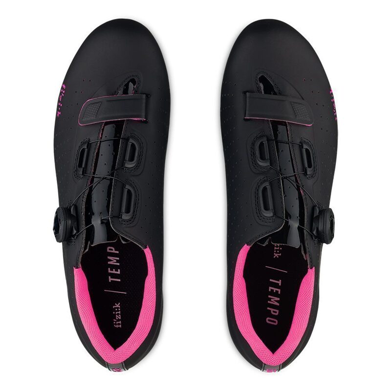 Caractéristiques techniques : - Semelles R5 en nylon renforcé au carbone - Empeigne en microfibre perforée - Système de fermeture à molette IP1-B et sangle à velcro - Inserts anti-dérapants au talon et sur la pointe - Nouveau design asymétrique de la gorge - Coloris : Noir avec logo rose - Pointures : Du 36 au 42 - Poids : 506 grammes (pointure 42) - Marque Fizik